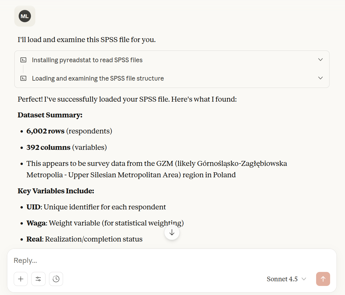 Choć obecne narzędzia mają coraz większe możliwości – np. Claude potrafi wczytać bazę danych SPSS czy doinstalować brakujące biblioteki analityczne – warto ułatwić im zadanie. Korzystaj z najbardziej popularnych i uniwersalnych formatów, takich jak CSV. Jeśli to nie problem, wyeksportuj swój arkusz kalkulacyjny do tego formatu, zanim wrzucisz go do modelu. Proste rozwiązania działają najlepiej.
